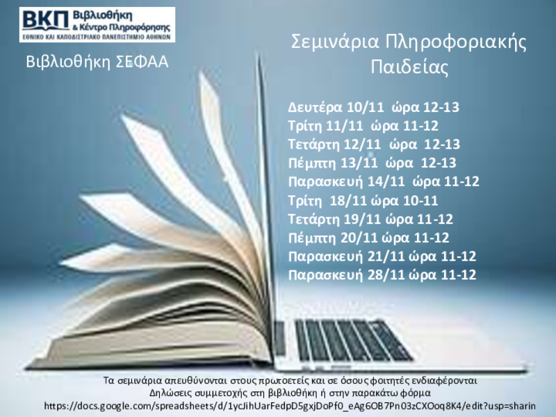 Σας ενημερώνουμε ότι στο χώρο της βιβλιοθήκης θα διεξαχθούν σεμινάρια